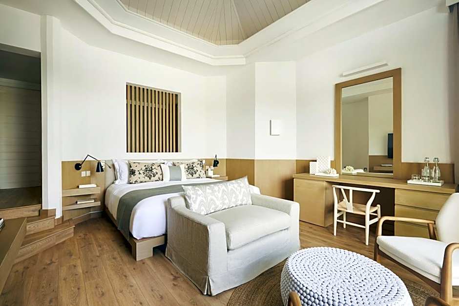 A 300 sqm Lux* Villa is set on its own peninsula with a sheltered cove and private beach. This villa consist of two bedrooms each with an ensuite retro chic bathroom with mood lighting, an outdoor beach view bathtub, a big rainfall shower, twin vanities and a separate toilet. The Lux* Villa comes with a living room & a dining room, outdoor sun terrace with a swimming pool, furnished gazebo, a dining area, a kitchenette, an entrance lobby. It features an outdoor shower, a dressing room, AC, mini-bar, safe, Tea & coffee making facilities including a Café LUX* coffee machine and pods, 55” LED Interactive TV and IPTV Channels and All the technology (Wi-Fi, universal electric sockets, USB ports…)